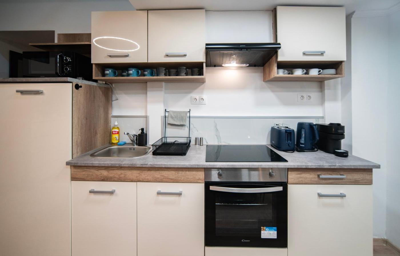 One-Bedroom Apartment. The well-equipped kitchen has a stovetop, a refrigerator, kitchenware and an oven. The air-conditioned apartment offers a flat-screen TV, a washing machine, a tea and coffee maker, a dining area as well as ancourtyard view. The unit has 2 beds.