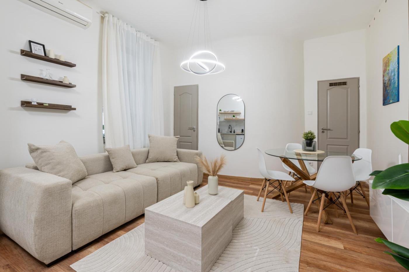 One-Bedroom Apartment. This air-conditioned apartment features 1 living room, 1 separate bedroom and 1 bathroom with a shower. Meals can be prepared in the well-fitted kitchen, which has a stovetop, a refrigerator, kitchenware and an oven. This apartment has a washing machine, a coffee machine, a flat-screen TV with streaming services and a balcony. The unit has 2 beds.